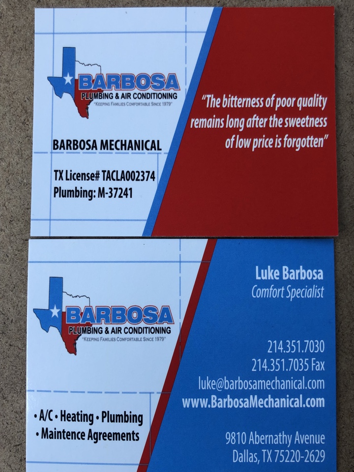 After spending two 105* days with a broken AC, Andy fit me into the schedule and Blake & Will arrived early, and did a serious AC condenser repair in about 1.5 hours. This makes the second time (plumbing issue was the first) we have called upon Barbosa and in both instances the work was quick. I consider myself a customer for life with Barbosa. Thanks! Tom Thomasson
