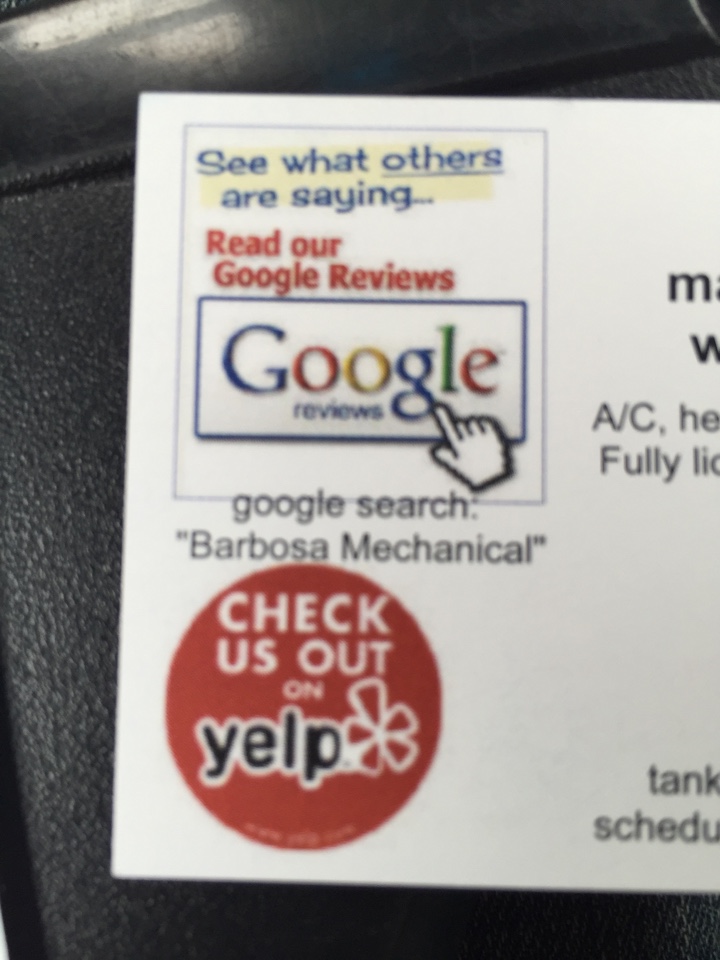 After spending two 105* days with a broken AC, Andy fit me into the schedule and Blake & Will arrived early, and did a serious AC condenser repair in about 1.5 hours. This makes the second time (plumbing issue was the first) we have called upon Barbosa and in both instances the work was quick. I consider myself a customer for life with Barbosa. Thanks! Tom Thomasson