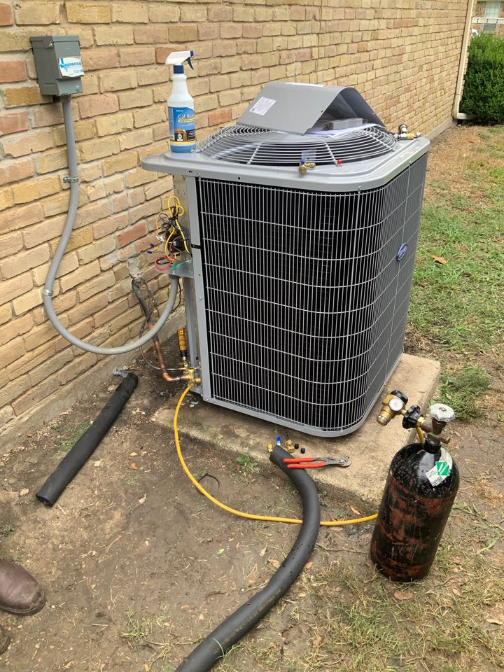 Replaced condenser due to previous unit having a leak. Replaced old Payne unit with new carrier unit.