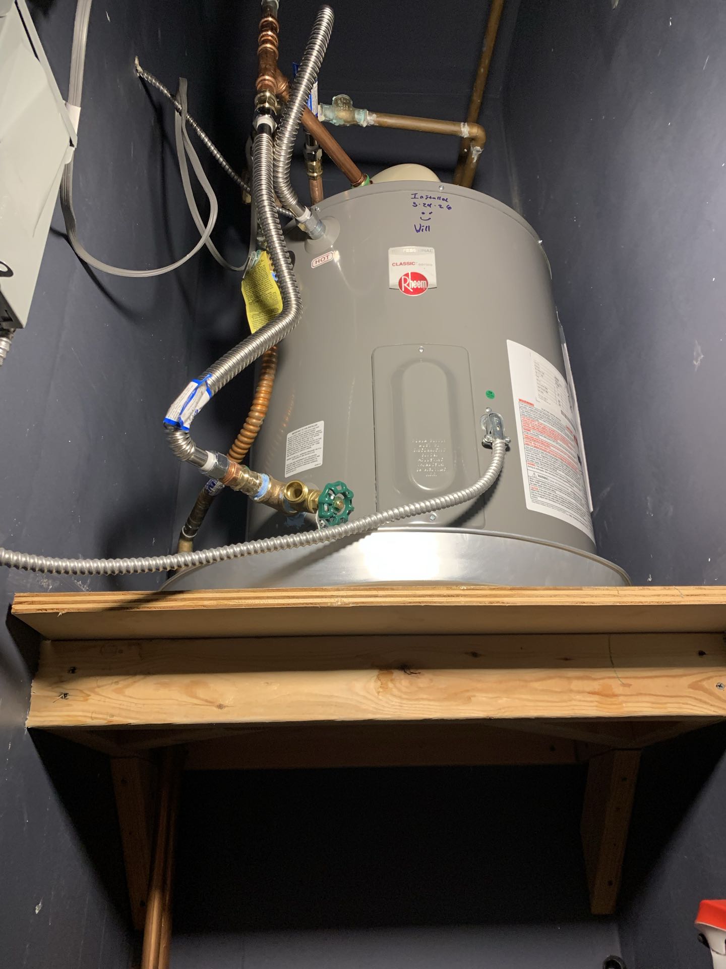 Repaired a Rheem 50 gallon electric water heater. Installed new Grundfos hot water circulation pump as well as hot and cold water flex supply lines.