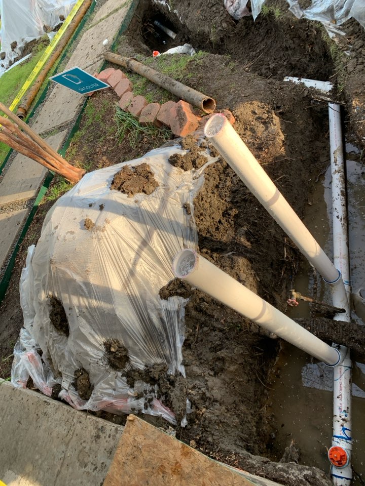 During excavation and tunneling to replace existing sewer pipe and repair water leak on copper cold water line under home