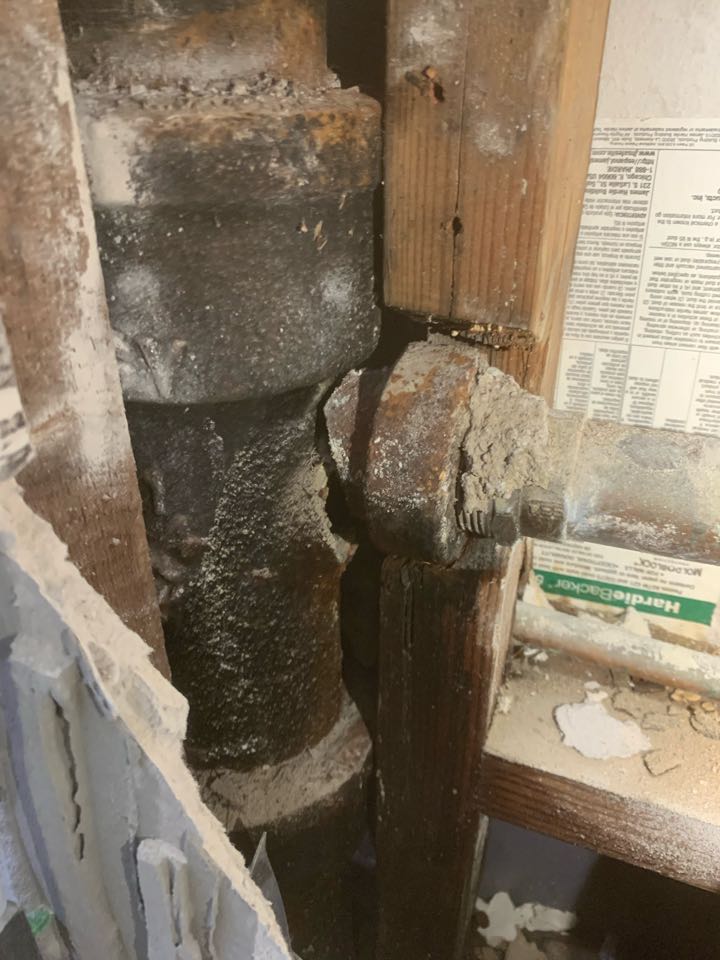 Plumbing repair, replaced broken cast iron sewer pipe behind bathroom wall