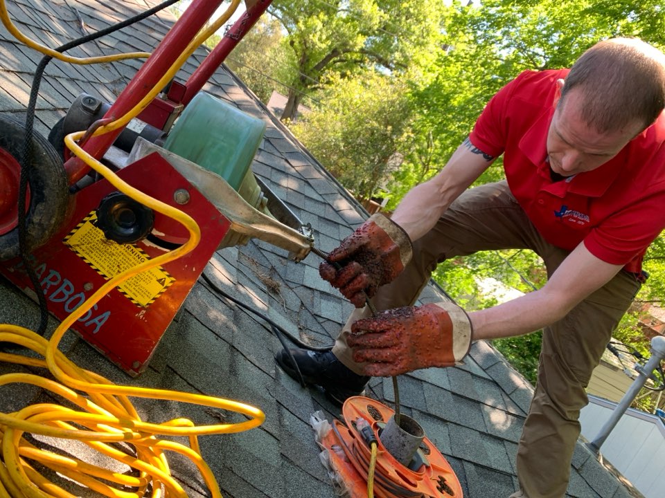 Sewer, plumbing, backing up above slab, using sewer machine to drain clean through roof vent